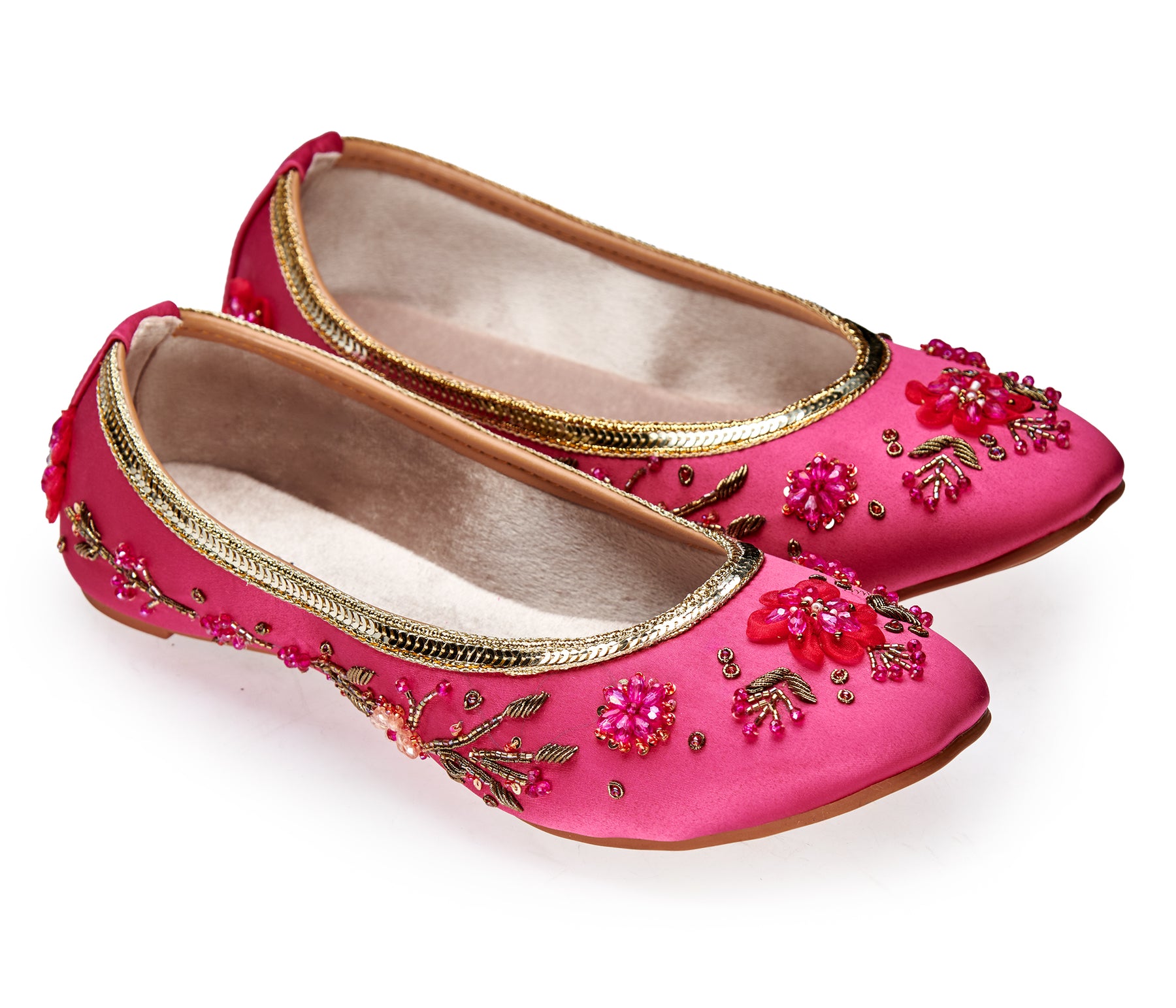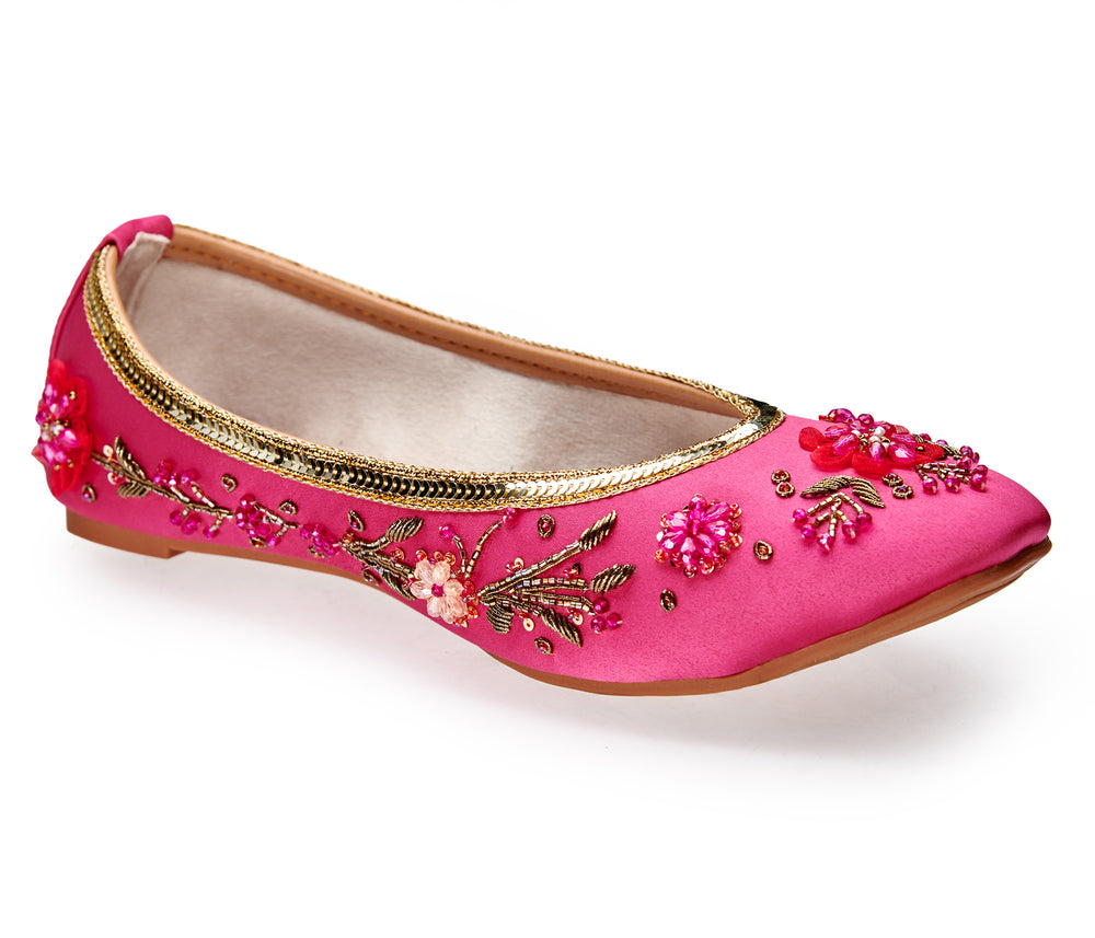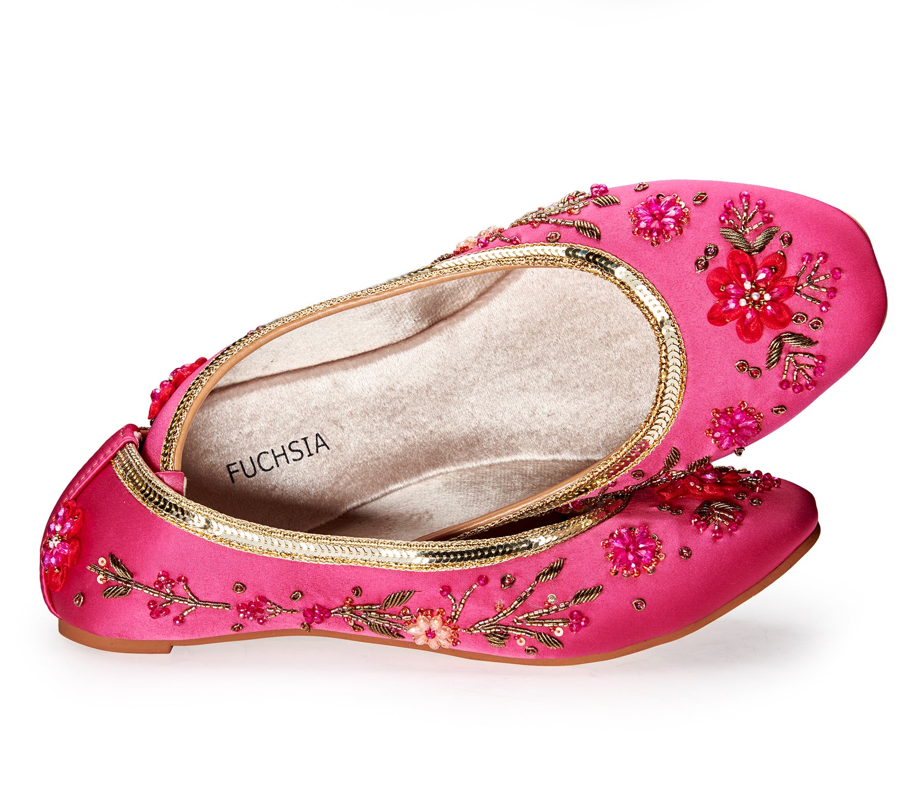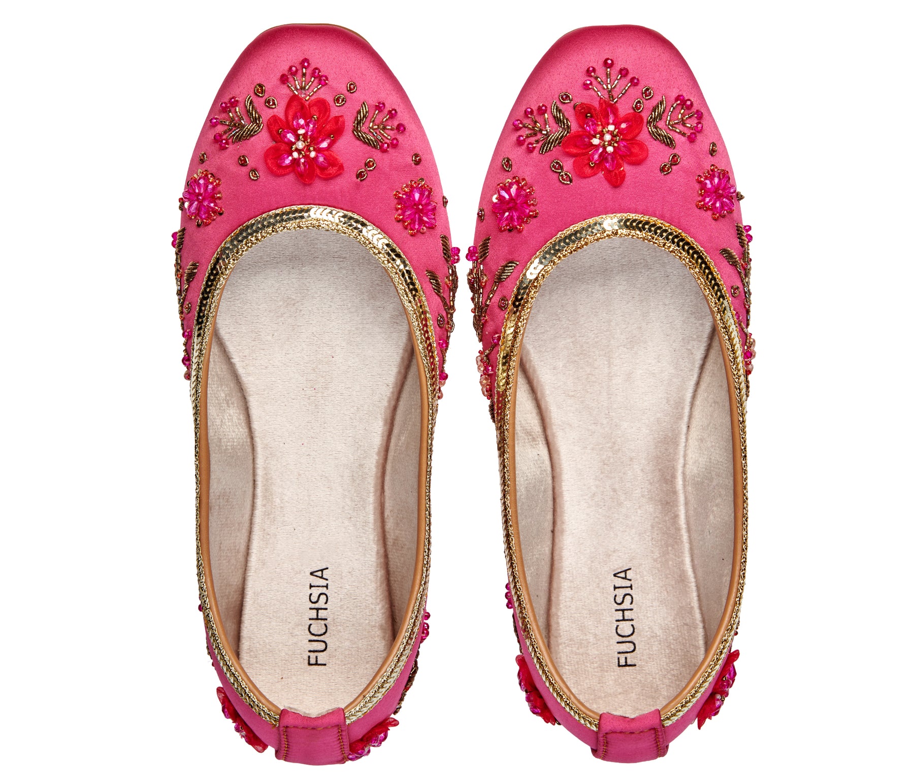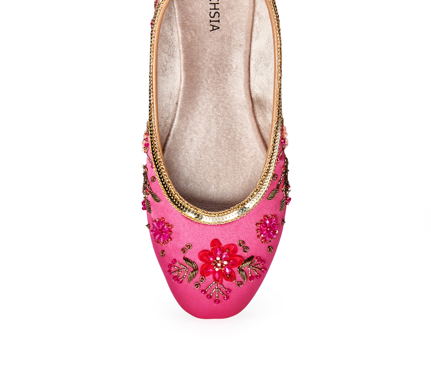 Inspired by Barbie's iconic style, our Malibu ballet flats bring playful glamour to your everyday wardrobe. Wrapped in vibrant hot pink satin and adorned with hand-embroidered floral details in fuchsia and gold, these flats are pure joy for your feet.