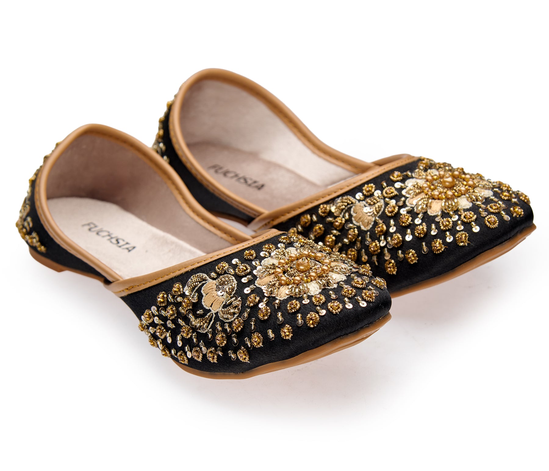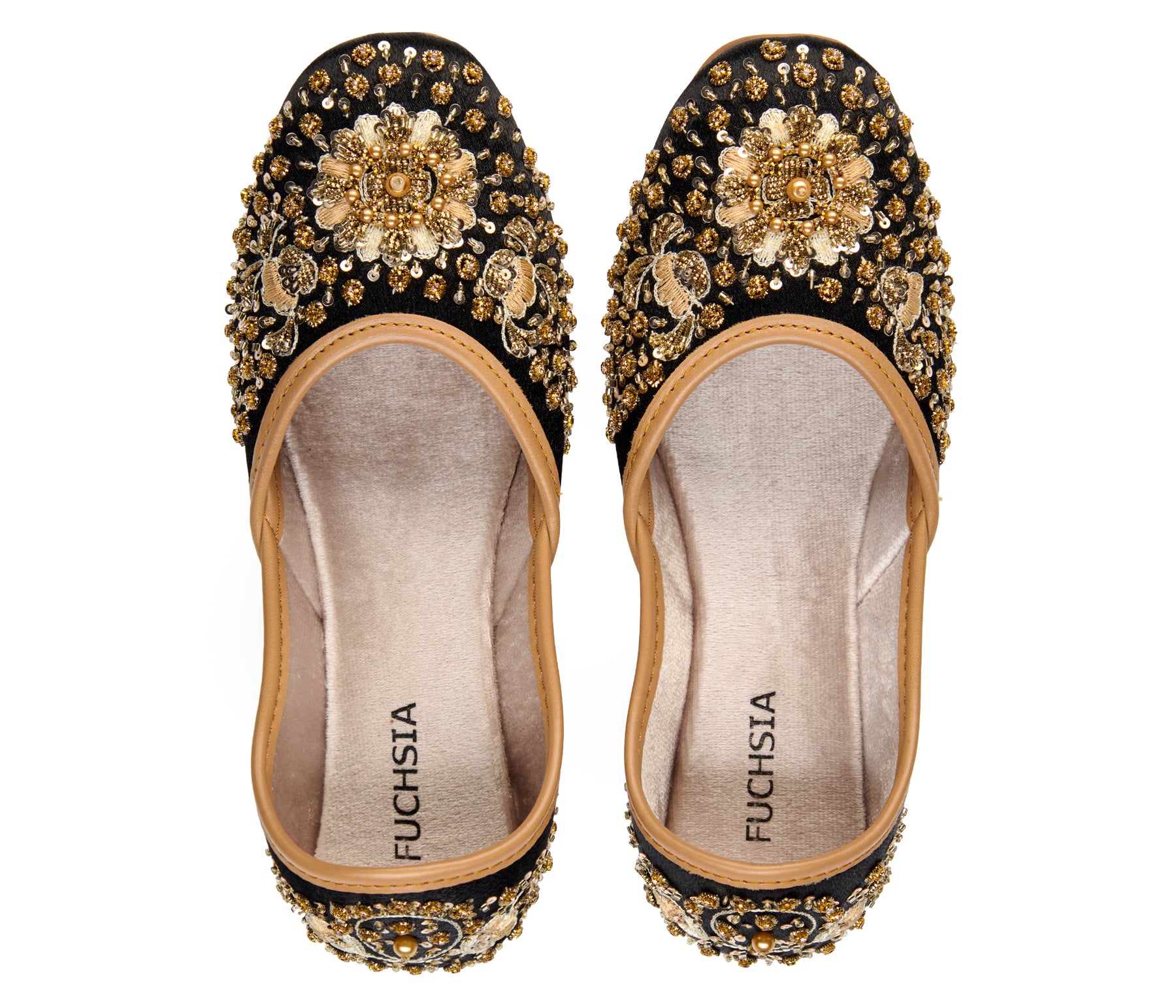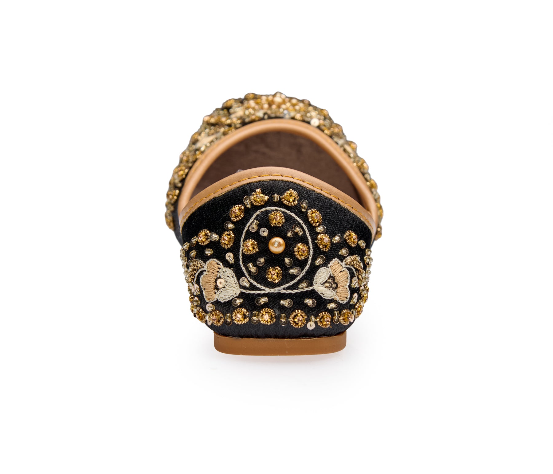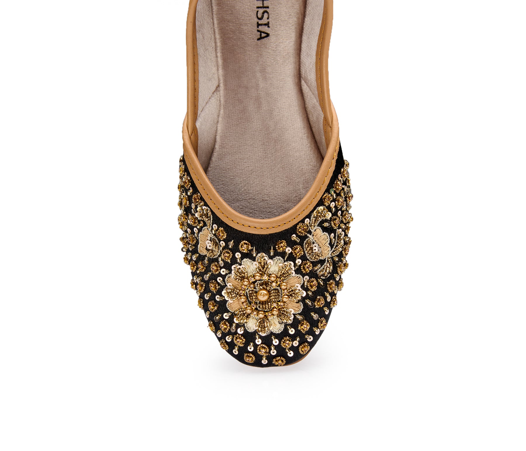 Crafted from sleek black satin and adorned with exquisite handmade beaded embroidery, these flats are a true statement piece. Perfect for any occasion, they offer timeless style and all-day comfort with their cushioned insole.