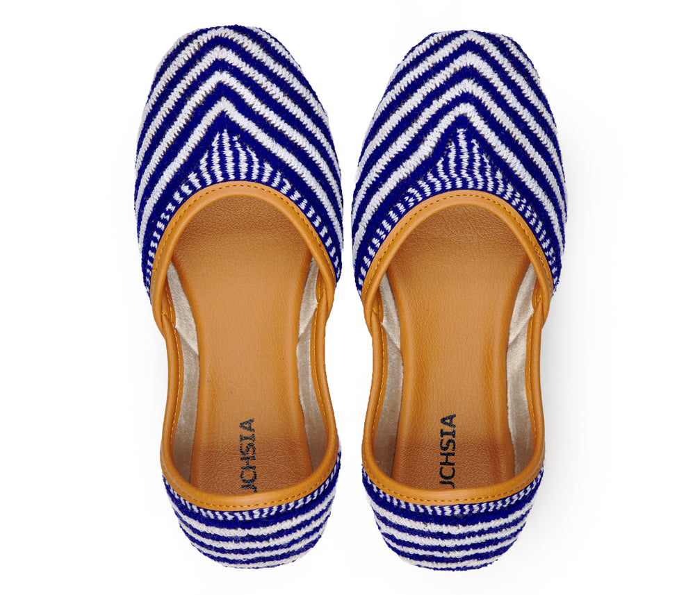 Elevate your footwear game with Fuchsia's exquisite Handmade Embroidered Blue Peplum Stripes Leather Flats. These flats are a delightful blend of fashion-forward design, impeccable craftsmanship, and all-day comfort.