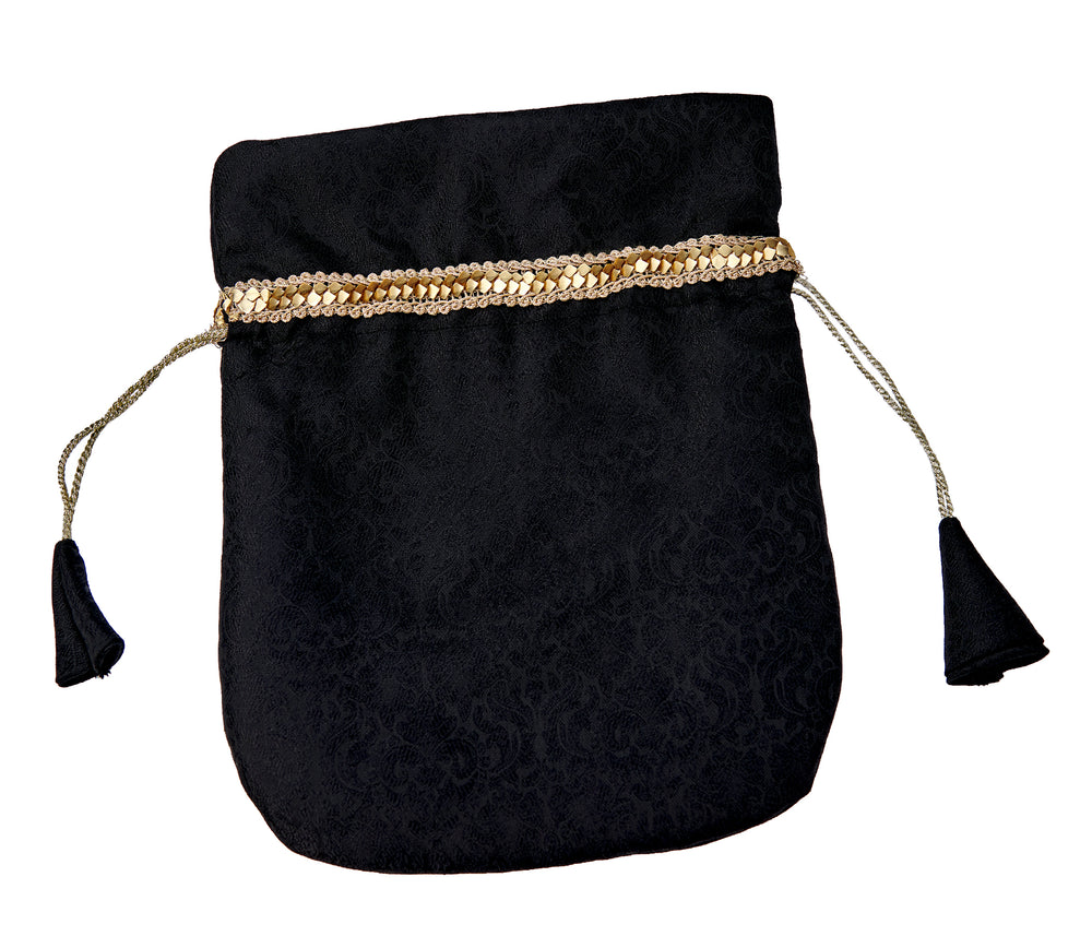 Handmade drawstring pouch we made to match with any Black flats from our shoe collection. We used a luxurious velvet fabric bordered with traditional "gota patti" lace. The bag is big enough to fit your mobile phone.