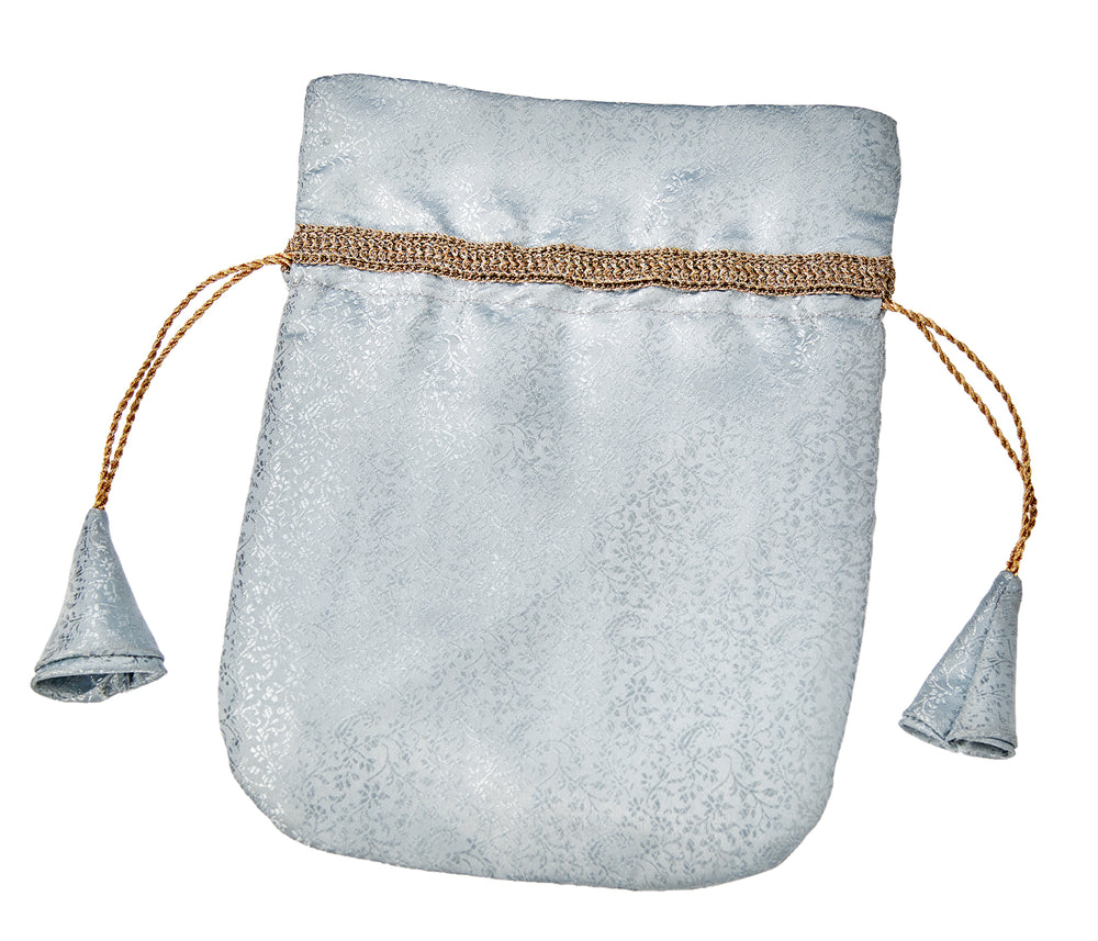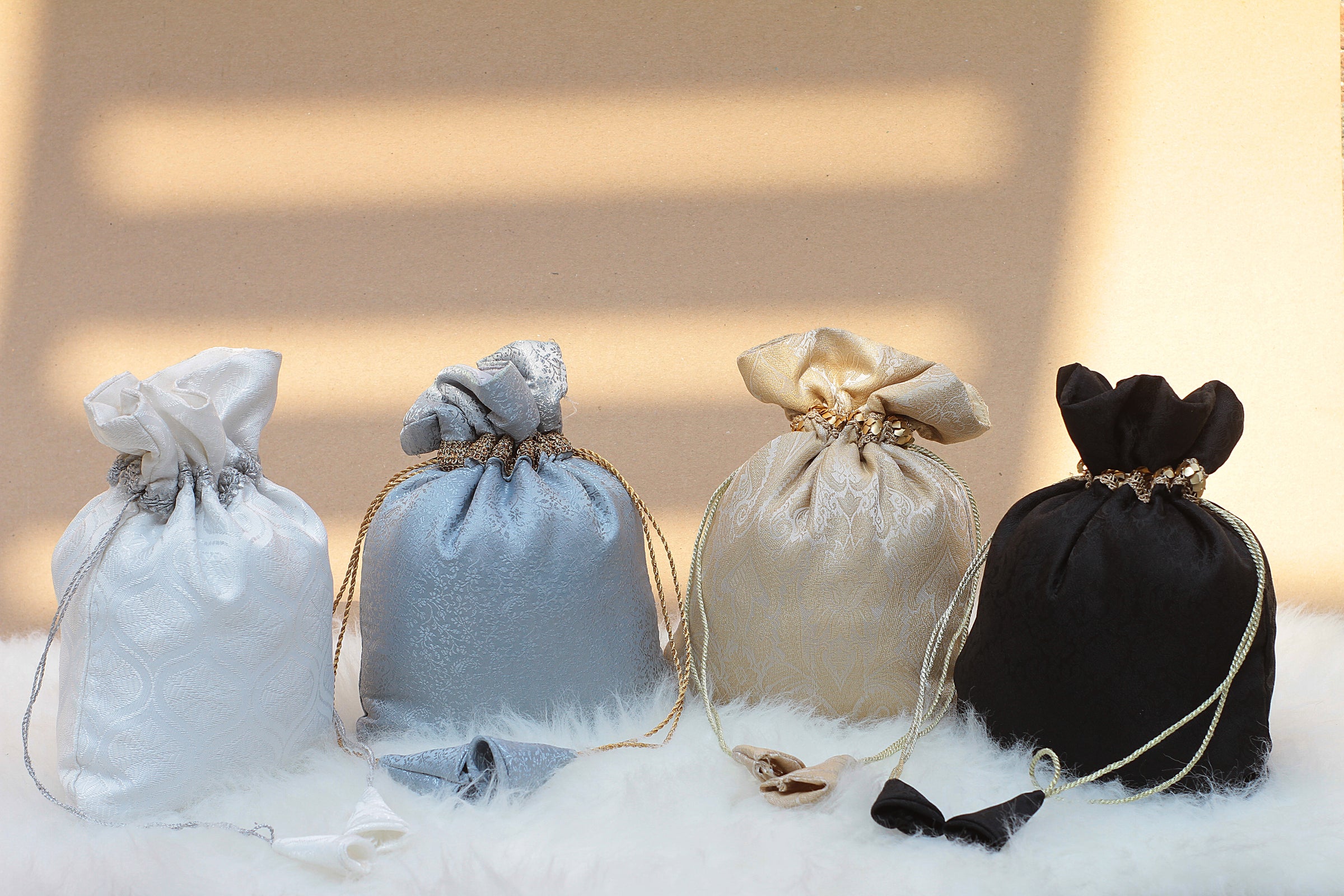 This handmade drawstring pouch, crafted from beautiful handloomed silk, perfectly matches the Nawal Flats from our shoe collection. We used exquisite brocade fabric, bordered with traditional gota patti lace. The pouch is spacious enough to fit your mobile phone.