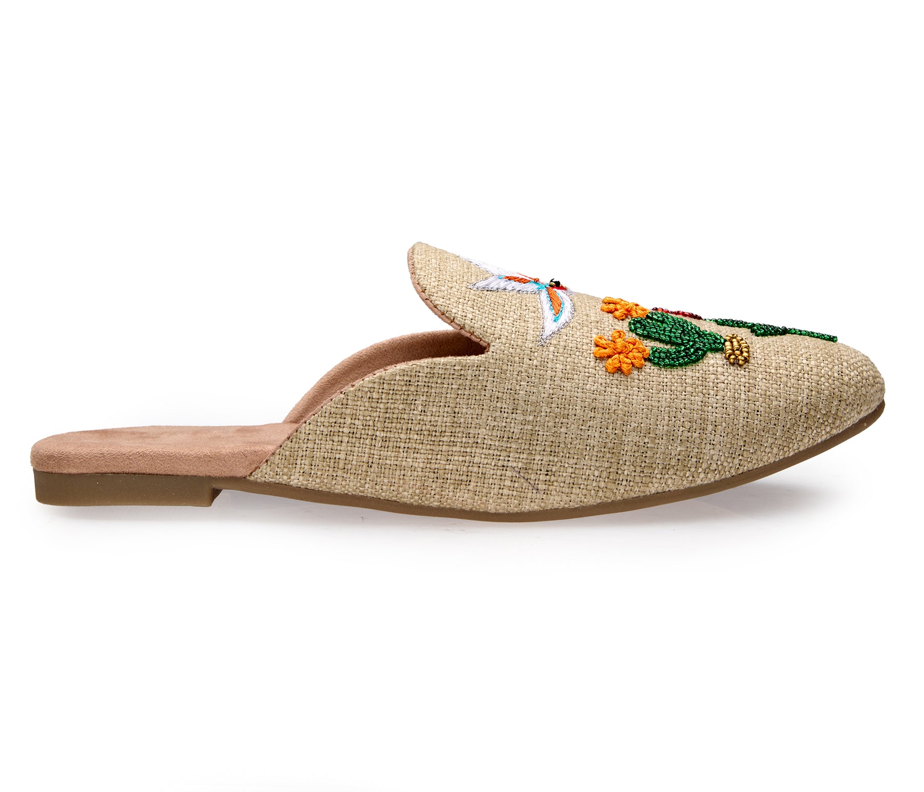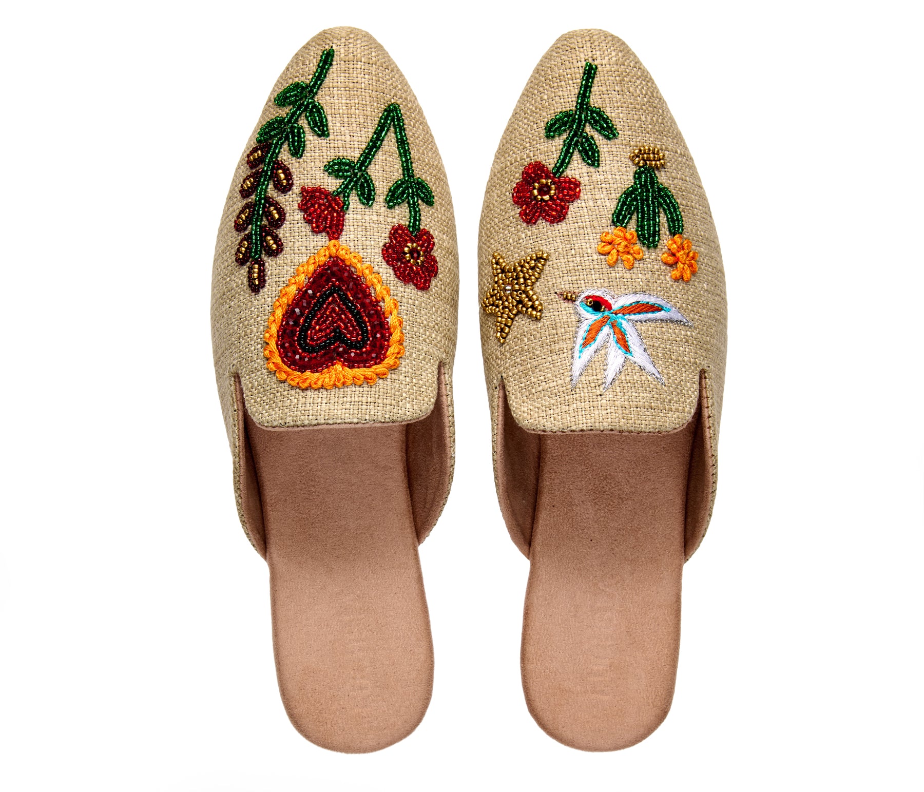 The Jardin mule is crafted in natural jute and adorned with whimsical hand embroidery—blooming florals, lucky stars, and delicate birds stitched by hand. Each pair tells a joyful story of craft, color, and ease in a relaxed backless silhouette made for everyday wear.