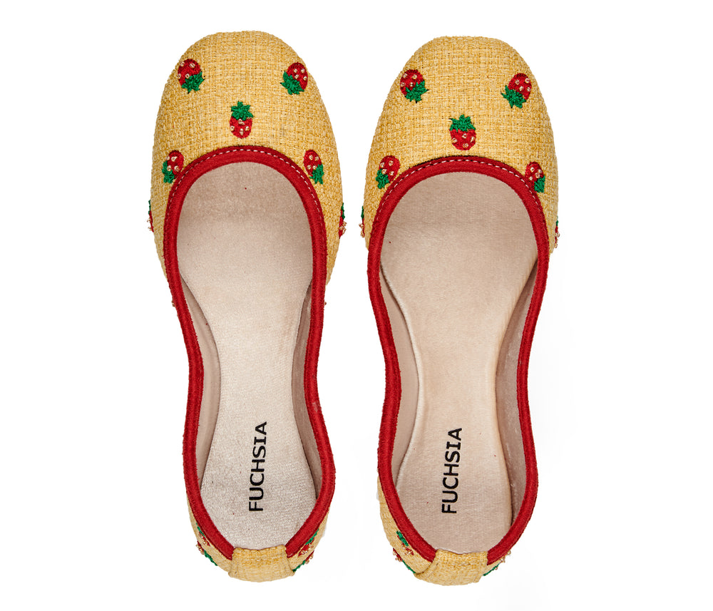 Berry Bliss Blue features hand-embroidered strawberries on a sunny butter yellow canvas-like upper. Designed in a classic ballet flat silhouette with no predefined left or right, they mold naturally to your feet. Built with maximum padding for all-day comfort and crafted in small batches by skilled artisans.