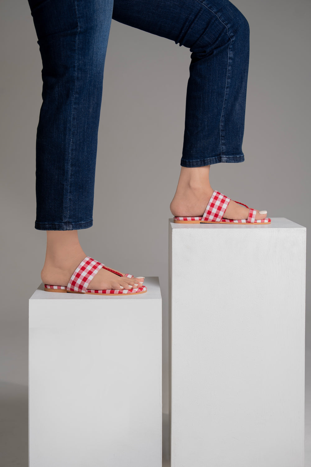 The Gingham Gul Kohlapuri sandal brings a fresh twist to the classic kohlapuri with a bold red-and-white check pattern, braided toe loop, and effortless comfort.