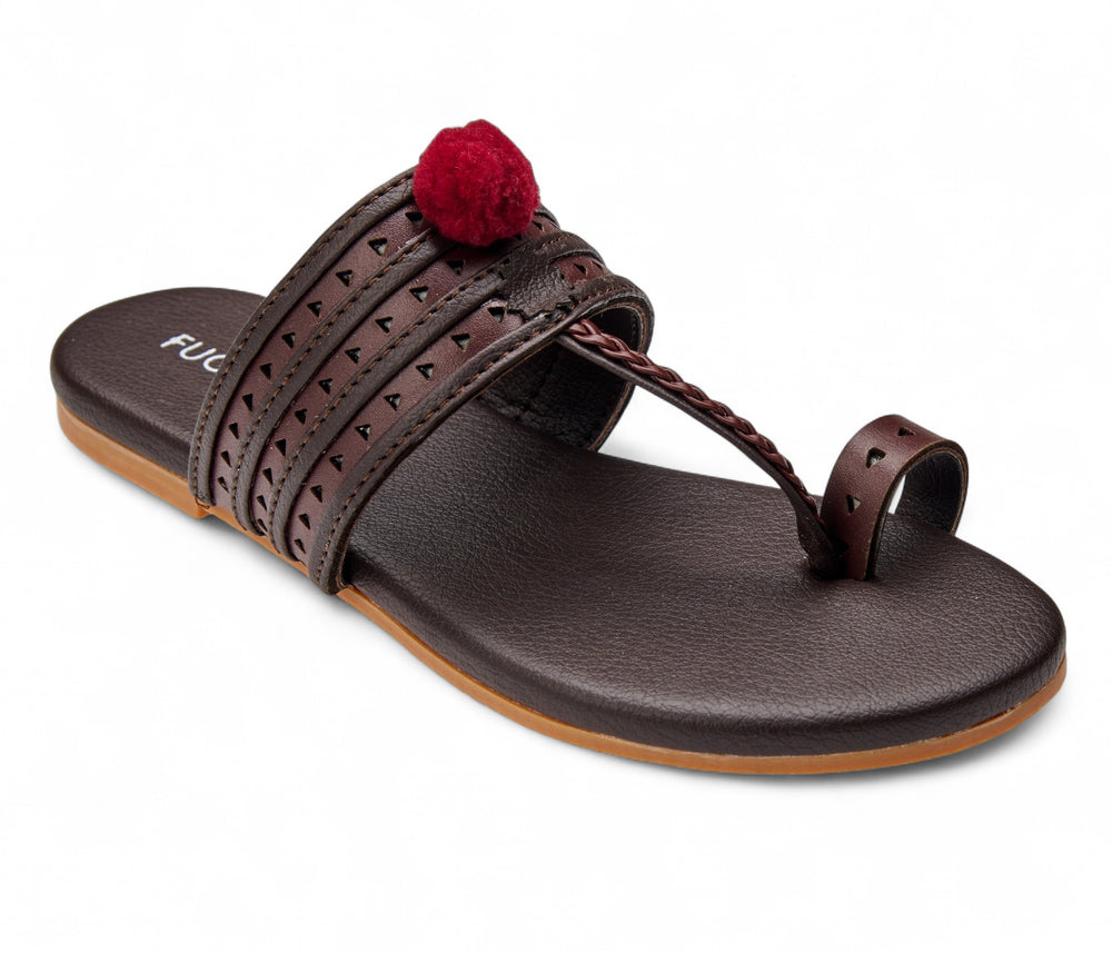 A timeless classic, Kohlapuri sandal. Handcrafted in rich brown man made leather with cutwork detailing, a braided toe loop, and a playful maroon pom-pom, this Kohlapuri blends heritage charm with everyday comfort.