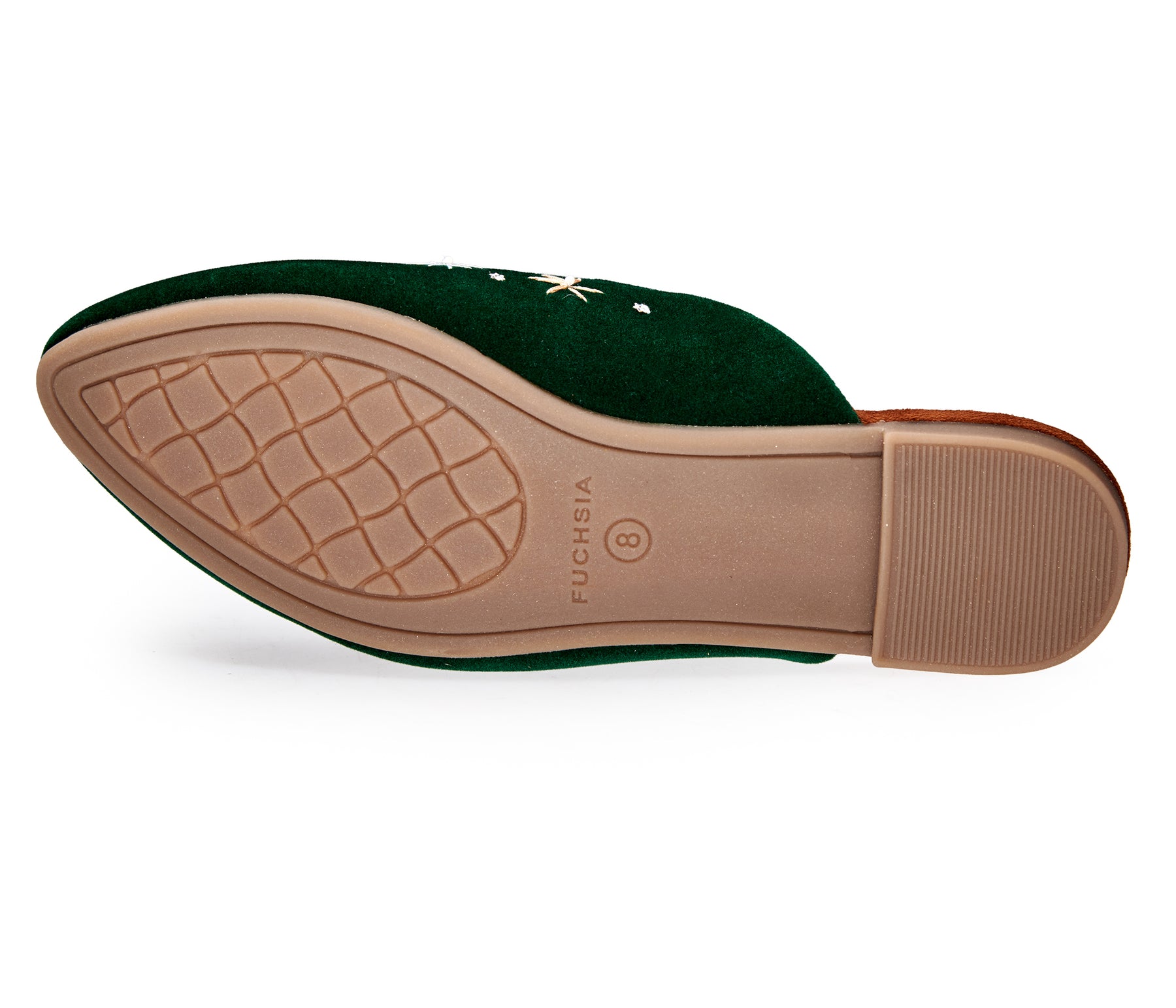 These emerald green velvet mules capture the sparkle of a winter night sky. Adorned with hand-embroidered stars and snowflakes in shimmering silver and gold beadwork, each pair brings festive elegance to every holiday gathering.
