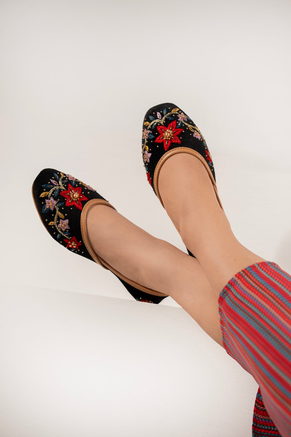 These stunning juttis feature an enchanting hand-embroidered garden of colorful flowers dancing across rich black canvas, creating a masterpiece that celebrates nature's vibrant artistry.