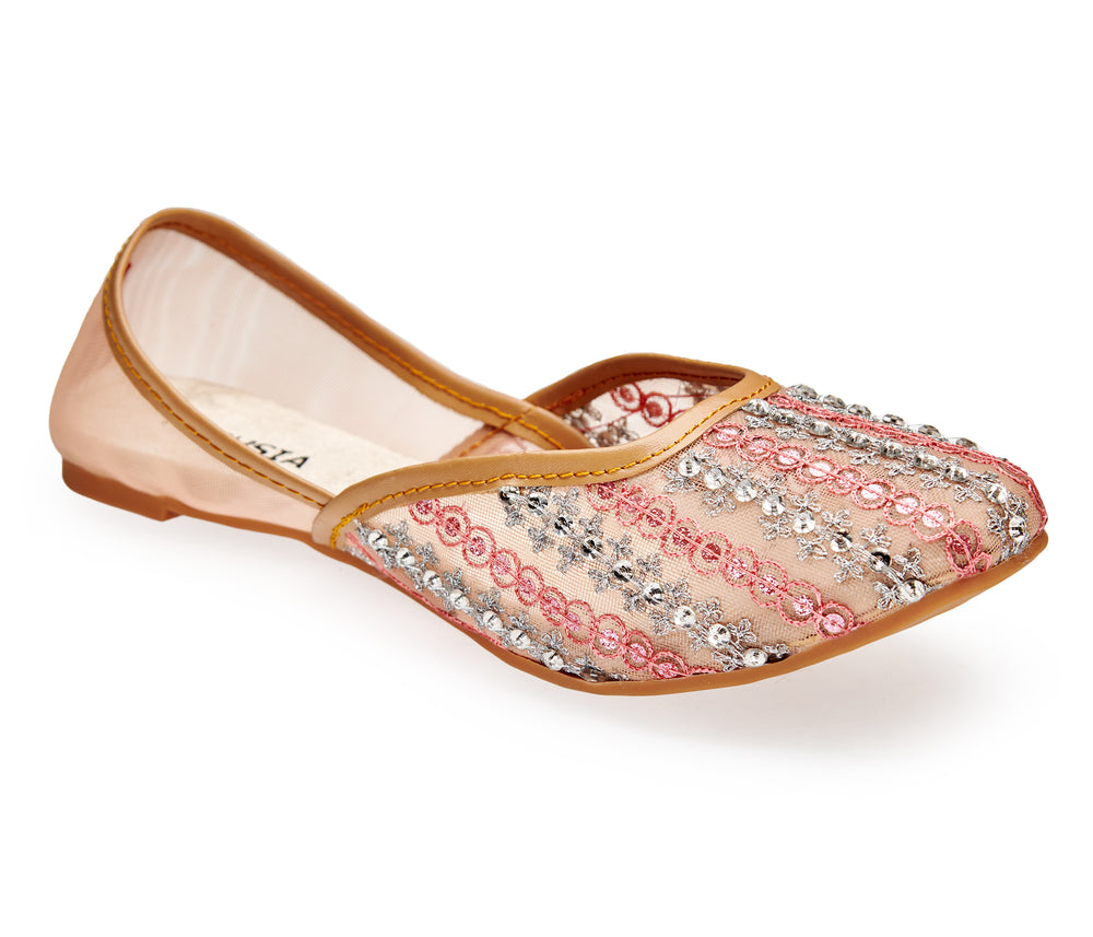 These ethereal juttis shimmer with intricate sequin embellishments in soft blush pink and silver tones, creating a dreamy ombré effect that captures light like morning dewdrops on rose petals.