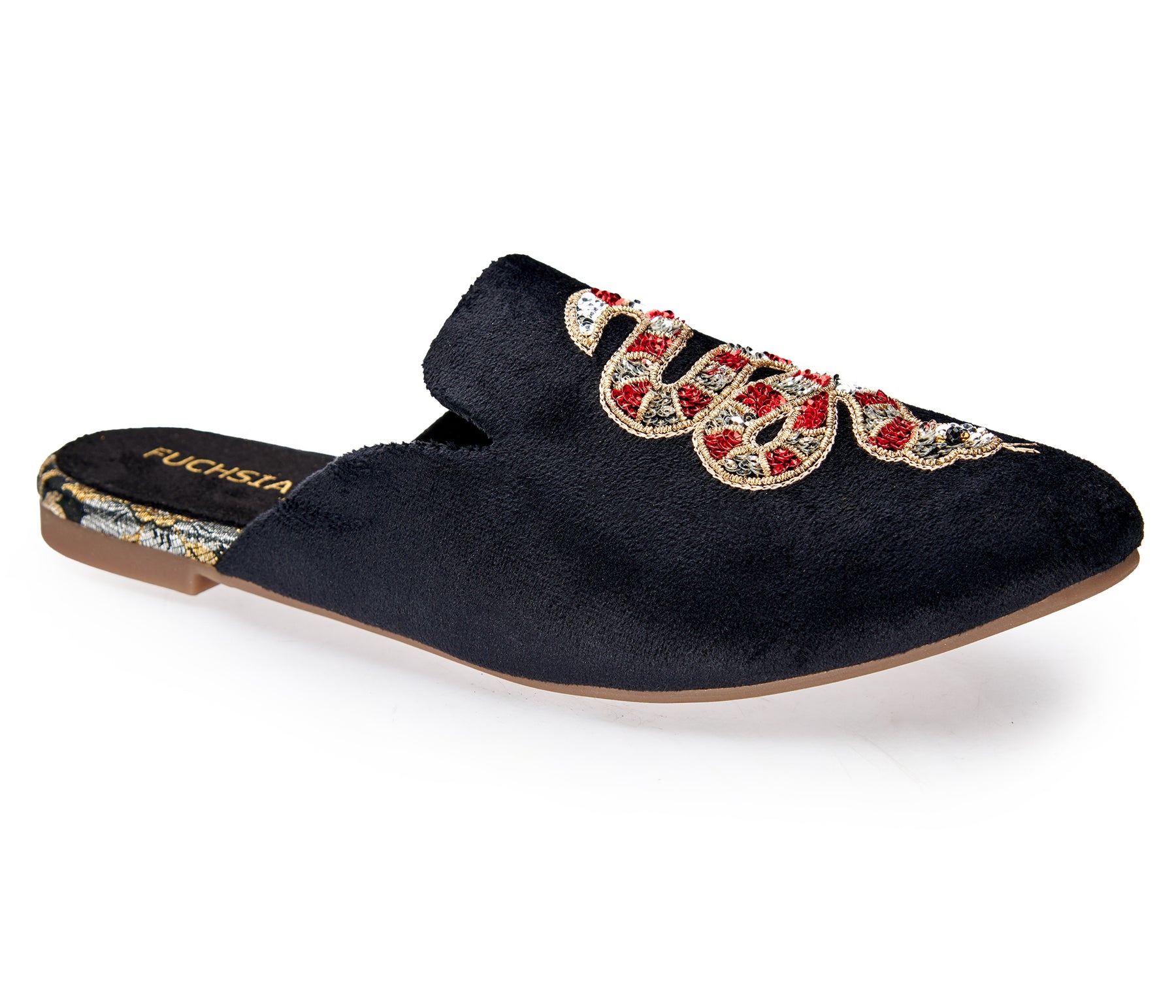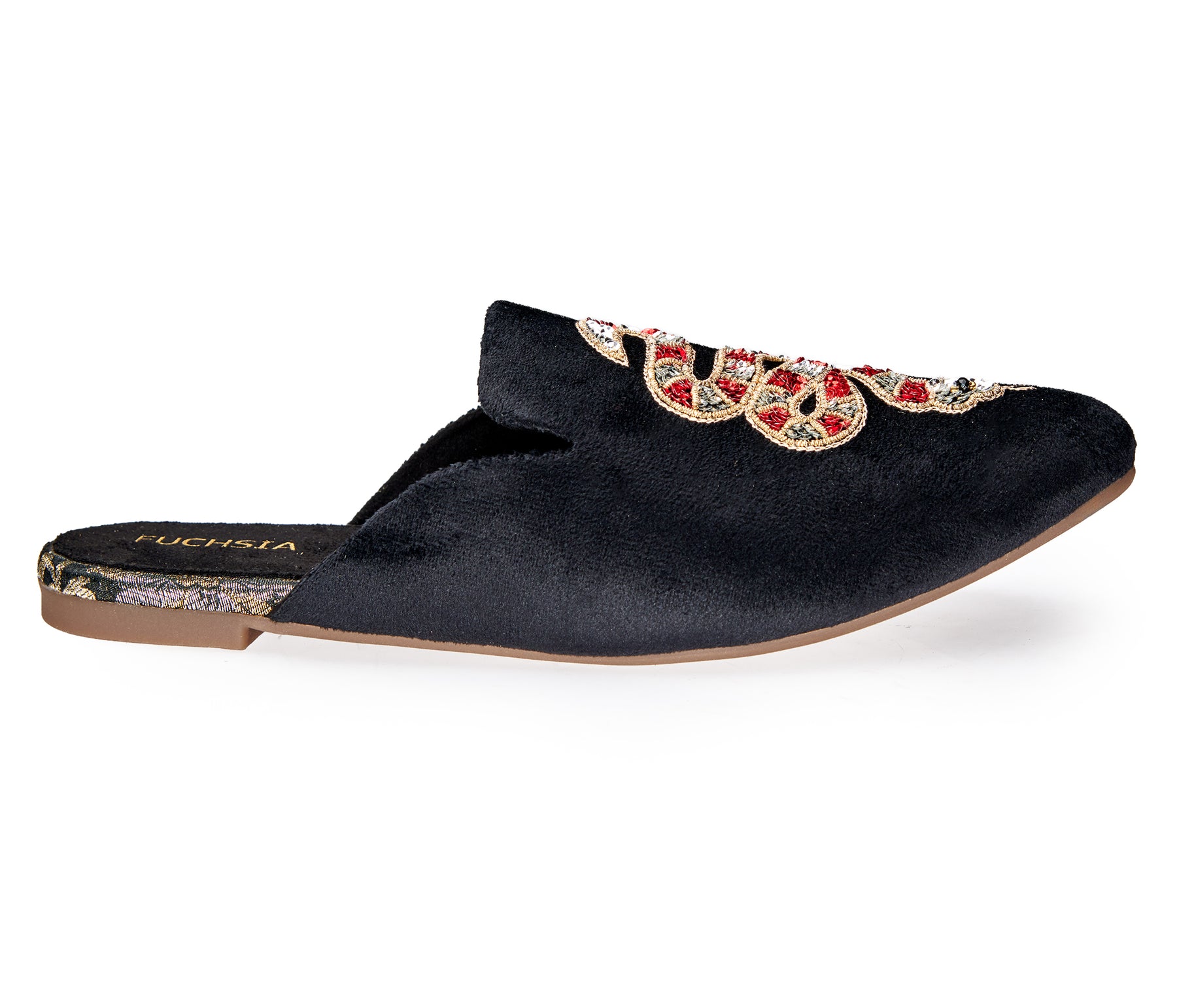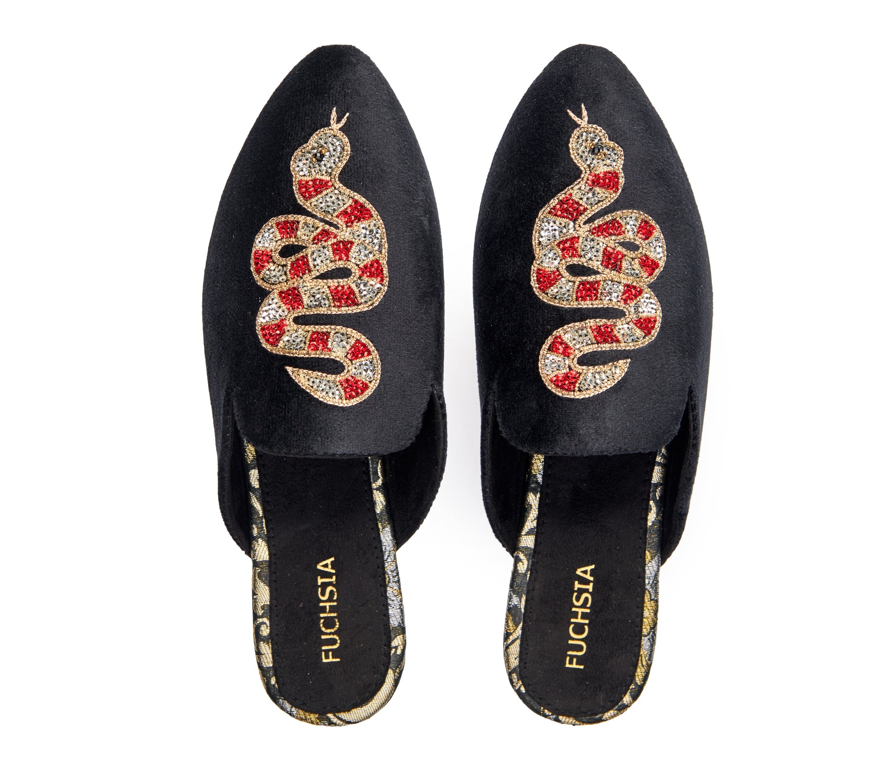 Edgy elegance in every step. The Serpent Black Mule features stunning hand-embroidered snake artistry on sumptuous velvet. Vegan materials, breathable comfort, and bold style for the modern woman.
